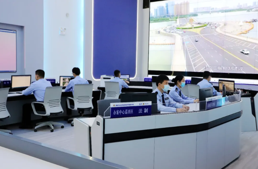 执法办案管理中心内部共划分为办案区、受立案区、物管中心、案管中心、合成作战中心五个功能区,当嫌疑人被押送到中心,合成作战中心就已将嫌疑人的基础信息全部准备完毕。合成作战中心融合指挥中心、刑侦、经侦、图侦、情报、法制、特巡警、反恐和反电诈等部门,实行联合办公、合成作战,设置“一席七区”,即合成作战指挥席,情报研判区、图像侦查区、反电诈工作区、舆情巡查处置区、巡防值守调度区、办案中心巡查区、专项研判区。合成作战中心实行平时、应急、战时三种运作模式,已接入视频监控、信通等大数据资源,实现了资源共享,一站式查询、数据侦查等功能,同步开展警情分析、线索处置、会商研判、联查联控、对策制定、同步上案等工作,为指挥决策、安保维稳和执法办案提供“全天候”、“全手段”支撑。