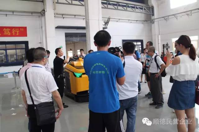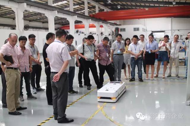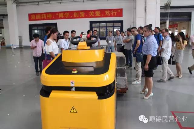 嘉腾公司专注于“脚”,致力于无人搬运车(AGV)领域的研发、生产、销售。公司产品获得多项国内外大奖,并代表中国机器人参加德国汉诺威工业展。活动一开始,嘉腾公司副总裁陈洪波就带领企业家们参观了嘉腾AGV总装车间,简单向大家介绍了AGV的应用原理。