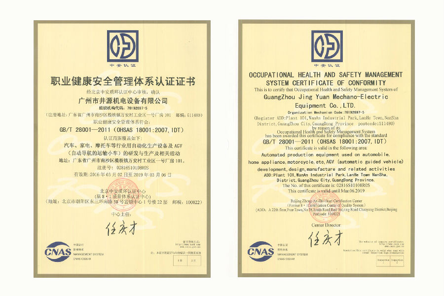 2016年3月7日,广州市井源机电设备有限公司正式收到了北京中安质环认证中心颁发的职业健康安全管理体系认证证书,标志着广州市井源机电设备有限公司正式通过了GB/T28001-2011的要求,实现了公司管理与国际标准化管理的接轨。