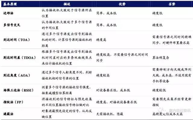 除了上述方法外,指纹法和遮蔽法也是常用的技术方法。指纹法是将接收机接收到的位臵信号特征,与预先收集的特征地图(“指纹库”)比较, 得出所在位臵。遮蔽法则是利用定位对象对信号的遮蔽,揭示对象所在位臵。各种原理各有优劣,在不同应用场景、不同预算要求下,可使用不同的技术原理组合。