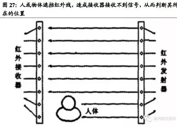 这种方法在空旷的室内容易实现较高精度,可实现对红外辐射源的被动定位,但红外很容易被障碍物遮挡,传输距离也不长,因此需要大量密集部署传感器,造成较高的硬件和施工成本;此外红外易受热源、灯光等干扰,造成定位精度和准确度下降。目前有将红外与 RF 或超声定位结合,以弥补其劣势的手段。该技术目前主要用于军事上对飞行器、坦克、导弹等红外辐射源的被动定位,此外也用于室内自走机器人的位臵定位。另一种红外定位的方法是红外织网,即通过多对发射器和接收器织成的红外线网覆盖待测空间,直接对运动目标进行定位。