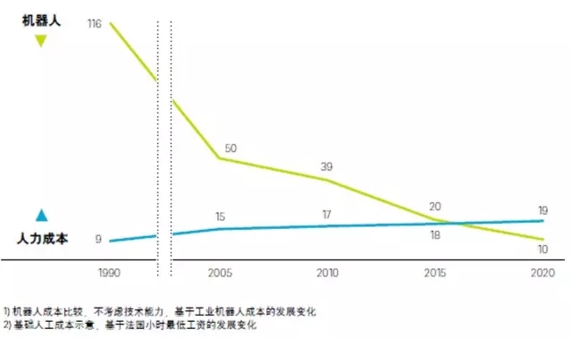 在连续使用的情况下,机器人的生产效率是人工的4-6倍,有望节约20%-40%的装卸搬运成本,并提高营业额;机器人正常工作平均花费18-20欧元/小时,低于欧洲劳动力成本昂贵的国家,而劳动力成本将不断攀升,机器人的平均花费将有望在2020年降至10欧元/小时以内。