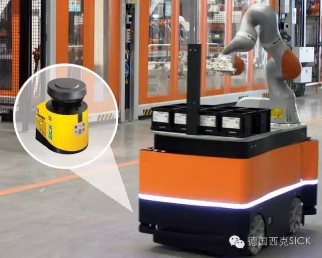 多年以来,库卡公司在其重载型平台Om-niMove上一直采用SICK 的长距离安全激光扫描仪,负载能力高达 90 吨的叉车的运用是建立在SICK安全激光扫描器S3000与库卡导航软件之间相互配合的基础上。当库卡KMR iiwa 机器人面世后,考虑到机械安装位置以及行走路径多区域的全方位保护要求,使用了SICK公司两台紧凑型安全激光扫描器 S300, 270°的扫描角度安装于车体对角可实现全方位监,同时具有 16 个可自由配置保护区域,能够灵活匹配不同的行驶路径进行相应的切换。对移动机器人的另一个应用要求是,需要坚固性外壳设计以及低能耗要求,S300在待机状态功耗仅为5W,为业界最低。