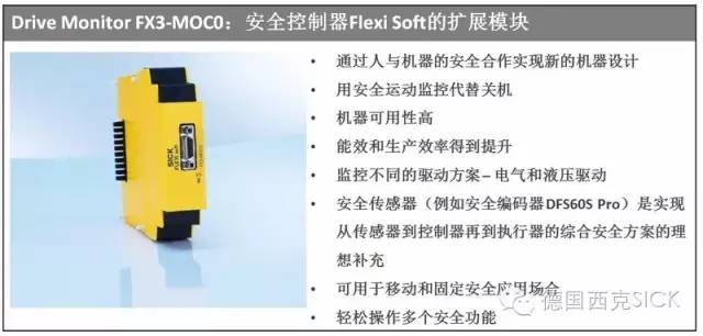 使用Flexi Soft和Drive Monitor FX3-MOC0,既可以监控电气驱动也可以监控液压驱动的机器。举例来说,当工作人员将手伸入安全光幕或者打开检修门时,不再需要通过完全断开整个驱动控制器的电源来触发所需的停止反应。机床(特别是压力机)的驱动技术正在向电气驱动,特别是伺服驱动装置转变。电气驱动装置可以有针对性地向流程提供能源。这样就可以更准确地控制流程、节省了成本并改善了产品质量。轴的更快移动同样提高了生产效率。