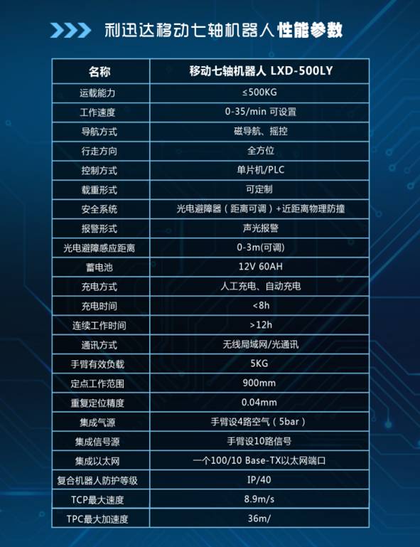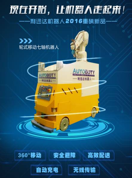 致力于推进国内工业4.0建设的专业工业机器人系统集成商——利迅达机器人相当重视移动机器人的开发与应用。利迅达机器人集合业界先进科研技术,结合国内企业生产需求,利用在智能工厂的应用经验,推出满足移动动态操作的轮式移动七轴机器人。其巧妙实现了自动导引牵引车与智能机械臂的有机结合,并集二者优势与功能于一体,创造性的设计在行业实属罕见!