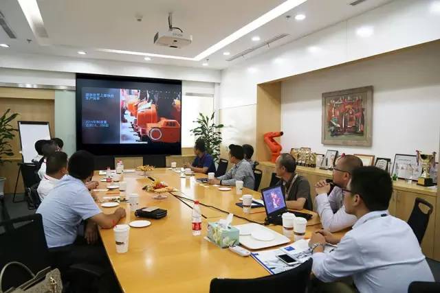 在上海ABB工程有限公司总裁(ABB机器人中国区负责人)李刚、机器人与应用销售总监邓奇、ABB中国区包装事业部总经理高一平等领导的陪同下,意欧斯董事长姜跃君、董事长特别助理黄安妮、董事会秘书朱霞敏、市场总监郑瑛及松盛总经理李强、运营总监刘小军等一行参观了ABB机器人生产车间及应用测试实验室,对ABB在机器人领域强大的研发及制造能力深为叹服。