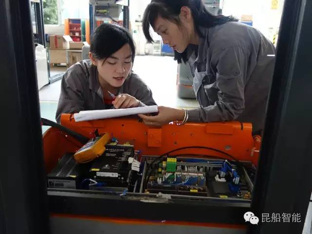 在车体周围,无论是机械装配还是电气装配的生产工人,他们正井然有序地忙碌于车体之间,工程部的工程师也正配合着生产部对已经装配完成的AGV进行查线、上电、调试等工作,大家密切配合、互相探讨,保证每一个环节都能顺利进行。