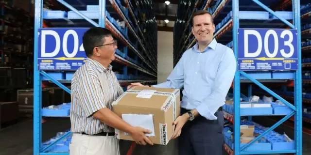 启动仪式上,畅联物流总裁徐峰先生带领永恒力一行参观了分拨中心并作了简要介绍。随后,永恒力亚太区零配件分拨中心工作人员完成了一系列订单检索、分拣货物、扫描、打包等订单处理流程后,徐总将永恒力分拨中心的第一个包裹亲手交到Markus Zoller先生手上。由此,永恒力亚太区零配件分拨中心正式启用,将服务于永恒力亚太地区所有的销售机构和渠道。