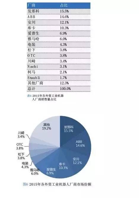 对比不同外资厂商2015年的销售情况,外资厂商仍以四大家族为首,即发那科、ABB、安川和库卡。四家厂商合计销售占外资品牌总销售量的比例超过50%,发那科销售量最高,占比达到15.5%。(见表6、图6)