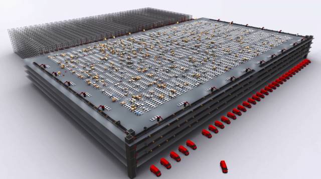 占据仓库核心位置的立体货架可以充分利用空间,让仓储从“平房”搬进“楼房”,有效利用率宝贵的土地面积。在狭窄货架间运转自如的料箱穿梭车(shuttle)是实现高密度存储、高吞吐量料箱进出的关键。它在轨道上高速运行,将料箱精准放入存储位或提取出来,送到传送带上,实现极高的出入库速度。