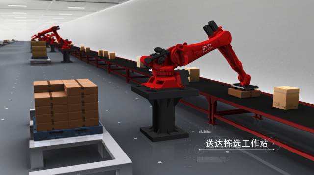 京东的无人仓中也有我们比较熟悉的机器人——六轴机器人可实现拆码垛,就是堆放和移动商品。码垛算法的指导下,每种商品都可以自动生成个性化的垛型,由机器人自动适配对每种商品自动码垛。