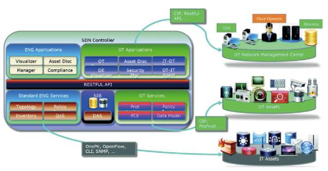 美国CISCO正在发展的一种软件定义工业网络的架构(图5)。图中SDN控制器中的标准工程服务通过OnePK、OpenFlow、CLI或SNMP等中间件转换为右下部的各种IT资产的运行数据;SDN控制器中的OT服务通过各种工业通信网络(如CIP、Ethernet/IP和Profinet)与图中右中部的各种OT资产相连接;图中右上部的OT网络管理中心与SDN控制器中的OT应用程序的链接,则是通过CIP、RESTFUL API等进行。