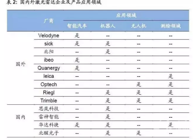 激光雷达的下游应用领域核心是无人驾驶汽车、服务机器人、无人机和工业测绘领域等。从目前全球激光雷达企业的下游应用领域分布来看,居多的仍然是智能汽车和机器人领域,传统的测绘领域中,也有一批3D激光扫描仪的企业,转型向更具成长性的机器人和无人驾驶领域。