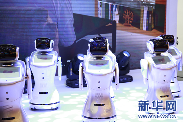 展区内的一款平台机器人应用终端,可提供不同的定制化智能服务。(新华网 鲁聃玉文摄)