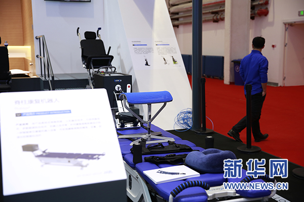展区内的哈工大载物爬楼机器人和脊柱康复机器人。 (新华网 鲁聃玉文摄)
