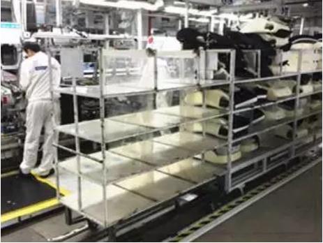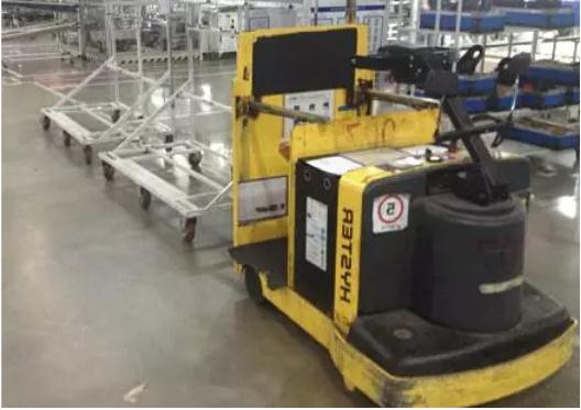 装有金属骨架的台车由小火车拖运,每次拖运高达6节车厢。拖运途中不仅会因为摆动造成交通隐患,更因为金属料架台车彼此的碰撞产生了较大的噪音。此外,线边台车摆放混乱,影响美观。
