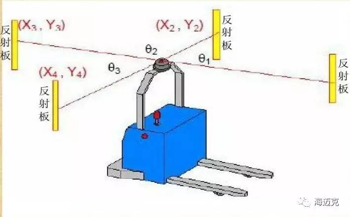海迈克AGV采用的是激光引导是引导方式,是除GPS外唯一不需要地面处理的引导方式。激光导引在AGV 行驶路径的周围安装位置安装若干激光反射板,先由人工驾驶AGV 通过激光扫描器发射激光束,同时采集由反射板反射的激光束,通过三角几何运算确定工作现场当前各个反射板的位置。然后在后台电脑中运用AI算法规划路径来实现AGV 的导引。