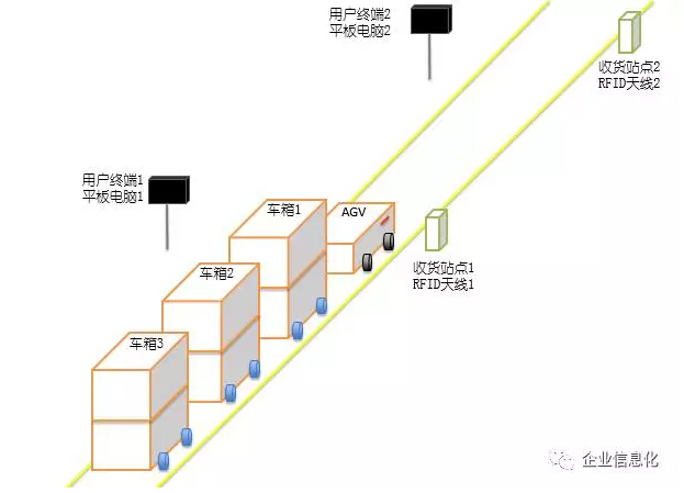 将每个RFID天线及RFID读写器赋予系统唯一标识ID,实时读取经过每个RFID天线的AGV上的RFID标签。