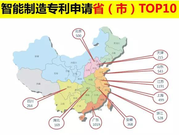智能制造专利申请最多的是江苏省(1191),其次是广东(1019),山东(543)。