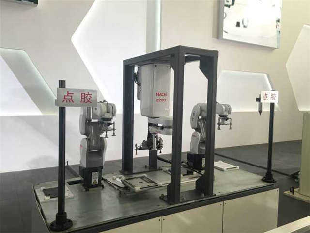在宝佳的厂区,你会看到应用在工业领域的世界上顶尖的机器人在展示、测试,近日网络上流传机器人可以给手机贴膜了,而在这个展厅里,你可以看到机器人干更高级的活,可以生产组装手机、平板电脑,一台多关节的机器人吸取放置台上的基板并把它安装在本体上,接着另一台小型的高速机器人吸起电池,并在上面涂粘结剂,然后在多关节机器人将基板稍微拿起的位置,由高速机器人执行电池的安装,一切都配合得那么默契、迅速。