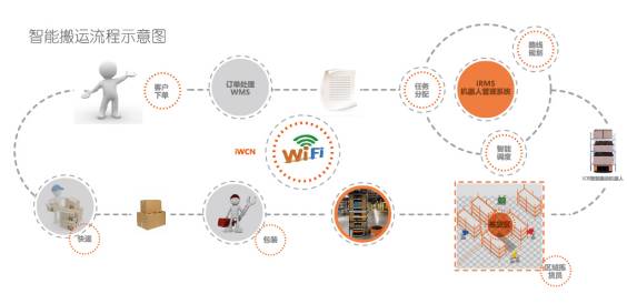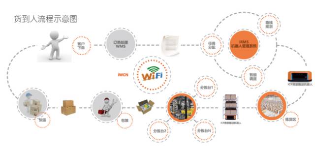 拣货区配置智能无线通信网络iWCN,机器人群体根据上述分配的任务,抗货架出发到拣货区