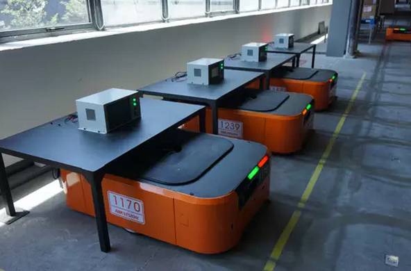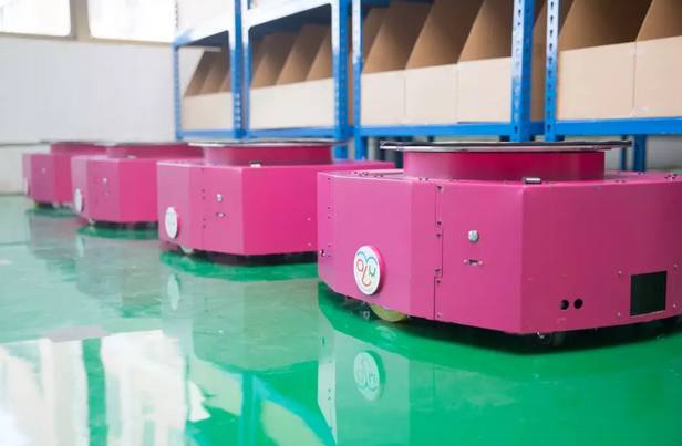 马路创新有一套自主研发的仓储系统,由多台AGV小车联动构成。AGV小车的功能是根据软件系统指令将指定货架运送至指定工作台,工作台完成拣选后再将货架送回软件系统指定的位置。