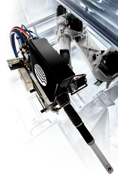 PTWA(Plasma Transferred Wire Arc,线材等离子电弧喷涂)技术是利用热喷涂层法以极高的速度对铝制汽缸内孔细密地喷涂钢液微粒。柯马Smart Spray系统化铝制发动机缸体为一个整体。这不仅减轻了发动机的最终重量,而且提高其耐久性,降低能耗。根据生产线的需要,本系统可用于一台或者两台机器人。