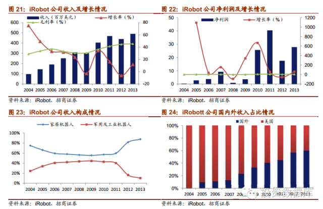 主营业务为家居机器人和军用机器人的销售,家居机器人在2011年之后成为最主要的收入来源,2013年销售占比约为88%,2014年上半年受中国市场强劲拉动销售额大涨15%达1.3亿美元;而军用机器设备因受美国财政预算收缩及以色列等地区军事需求下降的因素,2013年销售占比仅为约12%。国际销售占比逐年增长,2012年国外收入超过国内收入,2013国外收入占比达59%。