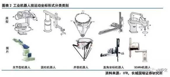 工业机器人可以按照程序输入方式、运动坐标形式、驱动方式、应用领域等四个方面进行分类。按程序输入方式区分有编程输入型和示教输入型两类;按运动坐标形式分为关节式机器、圆柱坐标机器人、直角坐标机器人、并联机器人、SCARA(平面关节型)机器人等五种;按驱动方式分为液压驱动、气压驱动、电气驱动等;从应用领域来看,主要有焊接、装 配、搬运码垛、上下料、打磨喷涂、切割加工机器人等。