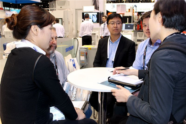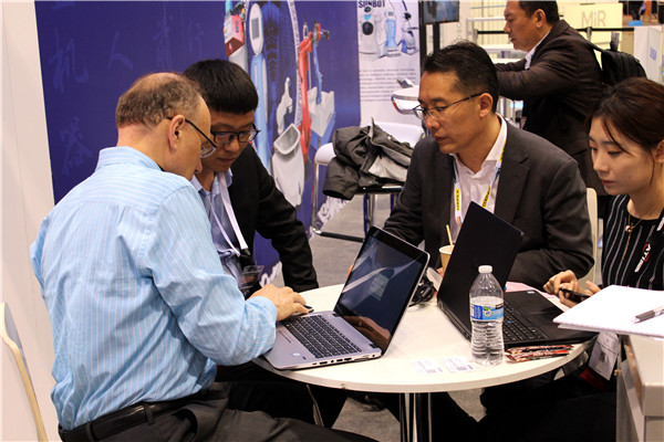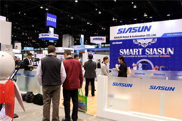 展会现场,来自不同国家的行业客户、系统集成商对新松参展的两款展品表现出极大的兴趣,纷纷驻足询问交流,与展位接待人员探讨在美国本土和其他国家,地区使用和代理新松机器人自动化产品的可能性。也有很多国际客户在得知新松公司参加此次展会后亲自到新松展位观看公司最新研发成果,与相关人员进行新项目的对接。