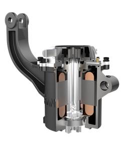 横摆外转子直驱伺服电机用来驱动集电杆实现横向摆动,该电机控制器系统采用直驱控制,避免了传动回差,实现了精确的位置控制,同时由于外转子电机转动惯量小,电机在非工作状态下,对线网的运动没有阻力,降低脱线发生的概率。