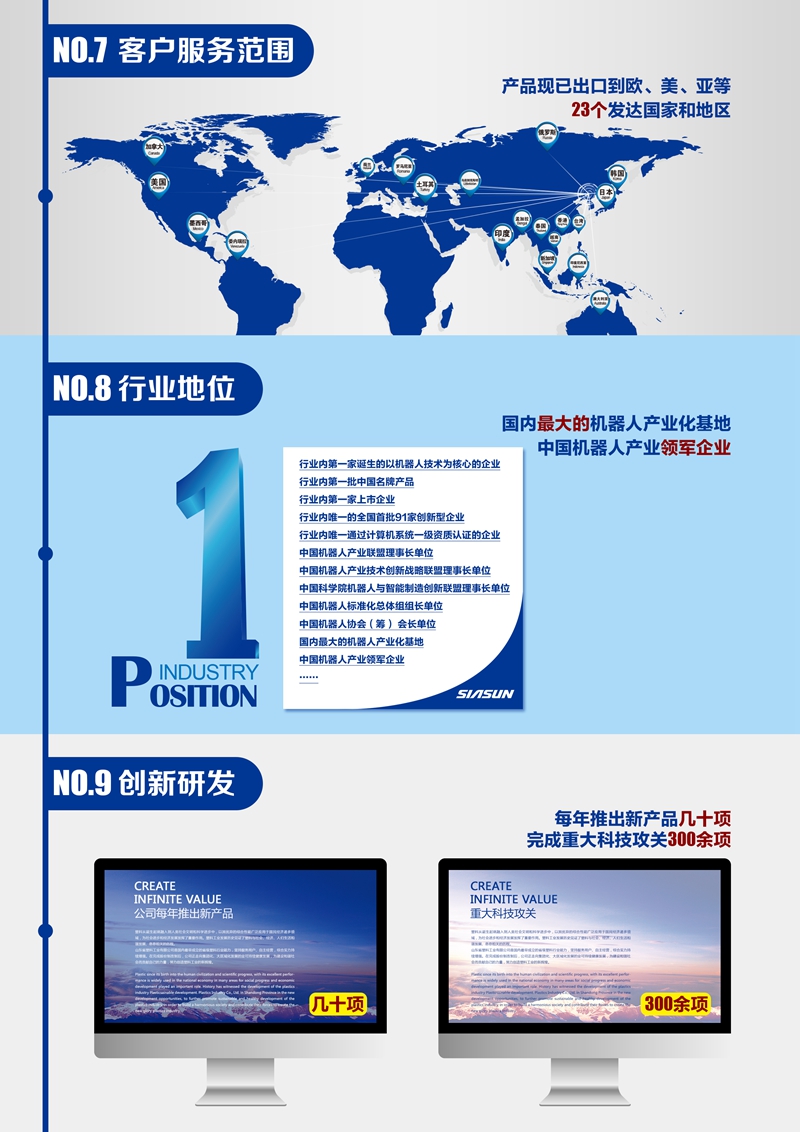 作为中国机器人产业头雁,新松已创造了百余项行业第一。成功研制了具有自主知识产权的工业机器人、协作机器人、移动机器人、特种机器人、服务机器人五大系列百余种产品,面向智能工厂、智能装备、智能物流、半导体装备、智能交通,形成十大产业方向,致力于打造数字化物联新模式。产品累计出口30多个国家和地区,为全球3000余家国际企业提供产业升级服务。