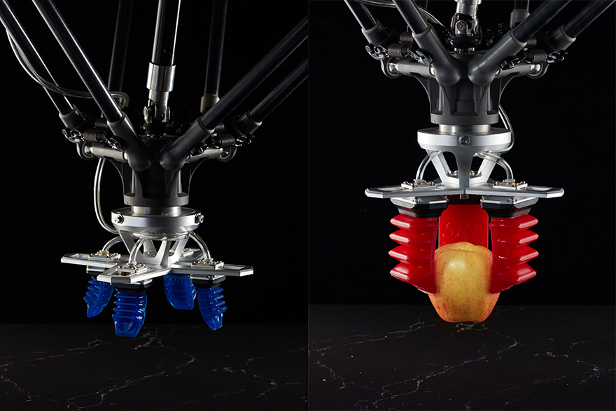 来自北京的创业公司SRT(Soft Robot Technology)研发的“机械手”采用的却是硅胶材质。充气时,这款柔性夹爪会胀大,并通过自适应包覆住不同尺寸、形状和重量的目标物体。