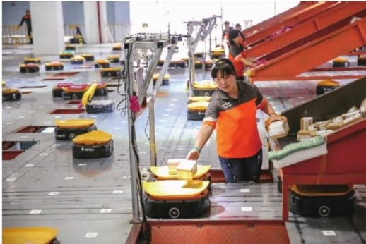5月3日,放件员将包裹放在机器人的托盘上。义乌申通公司的快递智能机器人分拣系统工作着700多个快递机器人,它们外观近似扫地机器人,顶部有一个活动托盘用来运载包裹。其分拣错误率低,效率高,可减少70%的人工。