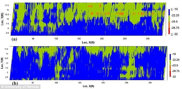 为了测试机器人检查员,研究人员在Pleasant Valley大桥做过检查,该大桥位于内华达州Reno的580高速公路。2016年7月28日至29日,机器人白天对大桥两侧的慢行道和路肩进行了调查。机器人将调查结果用不同的颜色显示:蓝色,没有腐蚀;绿色,腐蚀性很低;橙色,中等程度的腐蚀;红色,高度腐蚀。根据分析,研究人员认为大桥状况良好,机器人的精准度达到96%。