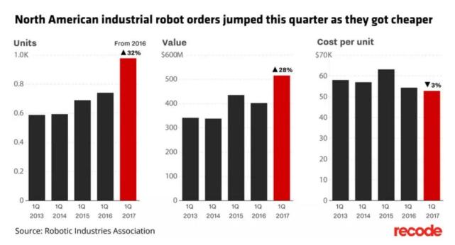 随着工业机器人售价越来越便宜,北美地区机器人采购数量大幅增长
