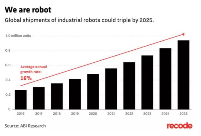 在全球范围内,机器人销量也有望增长。ABI Research预计,从现在开始到2025年之前,工业机器人的年出货量有望以2位数的速度增长。在不到10年内,全球机器人年出货量有望突破100万个。