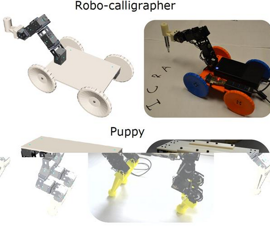 研究团队用这个工具尝试构建了一些不同的步行和轮式机器人。其中一个轮式机器人带有一个机械臂,可以握住一支钢笔来画画;另一个机器人类似一条四条腿的小狗,可以向前走或侧着走。