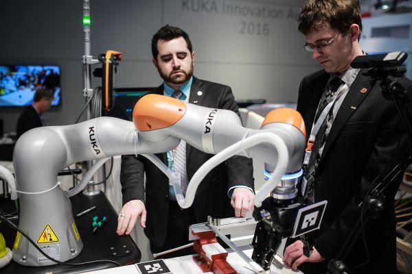 资料图片:德国库卡机器人公司展示机器人手臂。