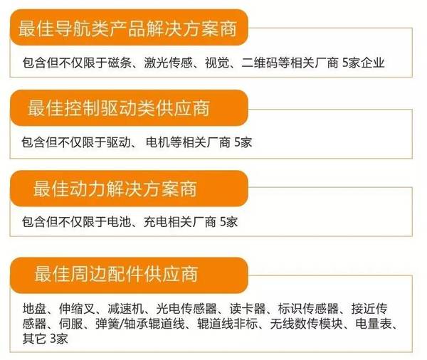 2017年AGV行业最佳供应商评选涉及材料供应商,核心配件、解决方案的相关厂商及模具制造商,通过设置各细分领域的最佳供应商,全面寻找AGV行业各细分领域龙头及杰出贡献者,并藉此帮助AGV机器人本体品牌商寻找优质供应商。