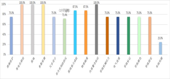(2) 在电气隔离防护方面,75%的产品绝缘防护措施不规范;87.5%的产品电气系统和非电气系统未采取物理隔离措施,动力线、控制线未独立成组;