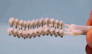 这小家伙是怎么扭起来的?其实在它波浪形的结构里面,藏着一个螺旋形的骨架。这个骨架在电机的带动下旋转,这个旋转最终在垂直方向上的效果就是形成了一个连续运动的波浪。
