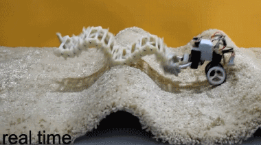 这个波浪小机器适应不同环境的能力还相当不错,它可以爬过不平的地面: