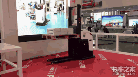 叉车头顶采用了一个激光探测设备,通过周围环境的反馈来确定车的实际坐标,然后根据环境来自动运行搬运工作。