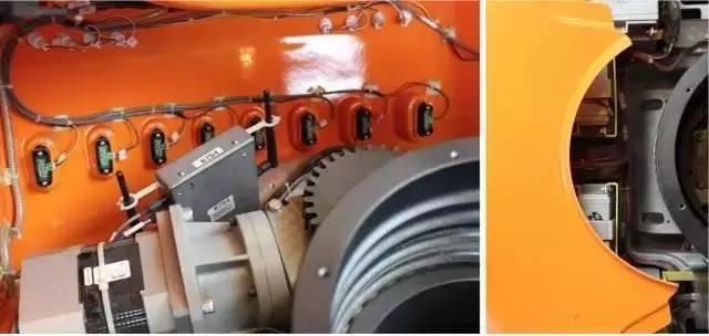 对于像Kiva这种大块的流线型外壳而言,做传统的一体化碰撞传感器是非常困难的。Kiva的工程师们找到了一个非常聪明的低成本解决方案:用乙烯/橡胶管充气,加上一个简单的气压传感器。一旦检测到管内气压变化,机器人就立即停止所有运动。 上图右边的黑盒子用于检测压力信号和所有红外传感器的信号,以简化与主控制器的协议和接线。