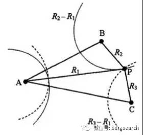 通过TDOA测量,可以得到未知移动台到两个基站的距离之差,即移动台位于以两个基站为焦点的双曲线上。引入第三个基站,可以得到两个以上双曲线方程,则双曲线的交点即为移动台的位置。如图2所示,A、B、C为三个已知位置的基站,P为移动台,R1、R2、R3分别为移动台到基站A、B、C的距离,其中R2-R1、R3-R1为定值。