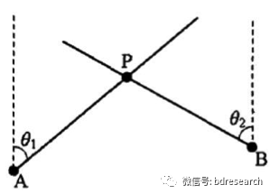 AOA方法是指接收机通过天线阵列测出电磁波的入射角度,包括测量基站信号到移动台的角度或者移动台信号到达基站的角度。每种方式均会产生从基站到移动台的方向线。两个基站可以得到两条方向线,其交点即为移动台位置。因此,AOA方法只需要两个基站即可确定移动台位置。如图3所示,θ1为移动台P的信号到达基站A的角度,θ2为信号到达基站B的角度。
