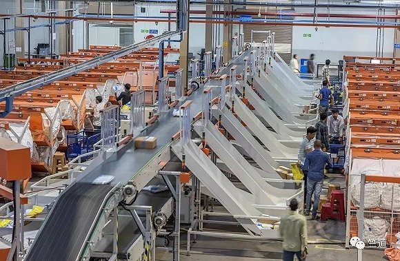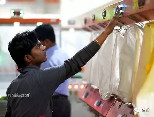 一辆大卡车停靠在班加罗尔的DTDC仓库里,其中的包裹正在被卸载到不停转动的运送带上。扫描仪自动读取包裹上的条形码,将它们按照类型、重量和目的地进行分类,然后由金属手臂将包裹从运送带上扫进大储藏箱。