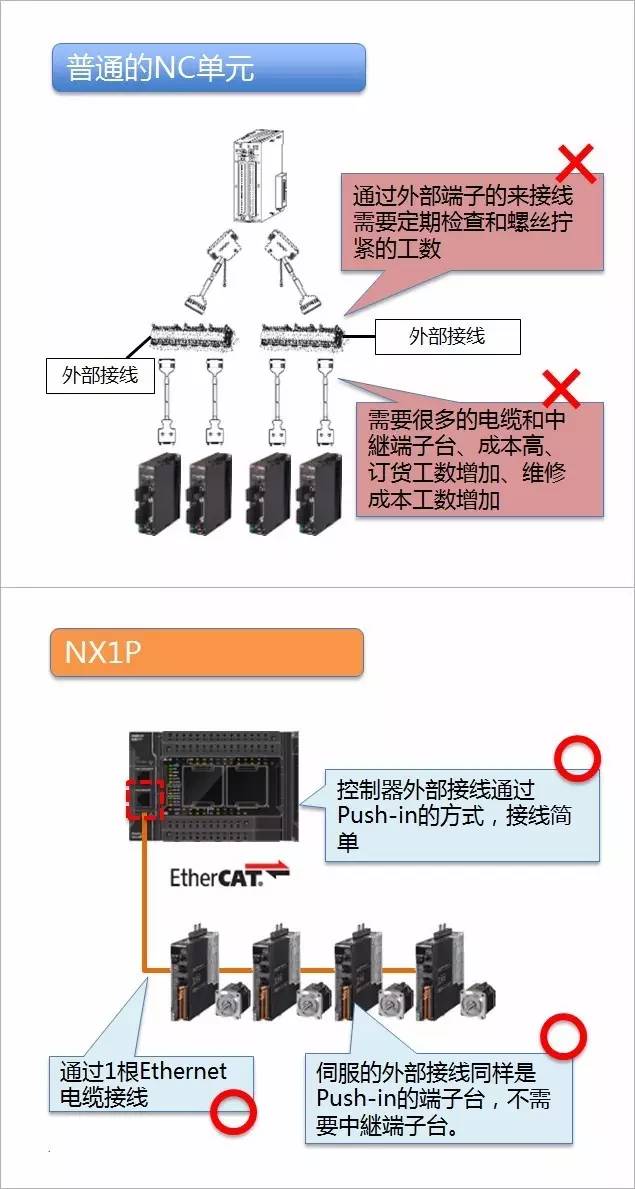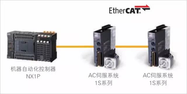 NX1P和1S伺服配套使用、通过1根EtherNet电缆即可轻松配线,并且1S伺服的I/F本身就是端子台、不需要中継端子台。