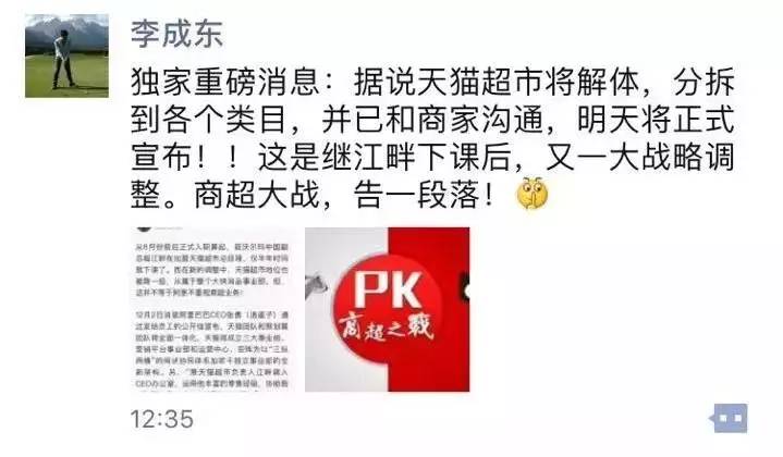 今日(8月2日),前京东战略分析师李成东在其朋友圈称,天猫超市即将解体,分拆到各个类目,并已与商家沟通,明日将正式宣布。